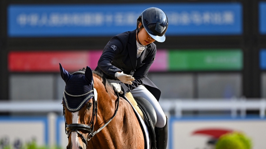 新华社照片,深圳(广东),2025年11月10日\n 11月10日,上海队选手徐墨菲在比赛后轻拍她的马匹“好好”。最终,上海队夺得团体赛冠军。\n 当日,第十五届全国运动会马术比赛盛装舞步团体决赛及个人资格赛在深圳举行。\n 新华社记者 冯开华 摄
